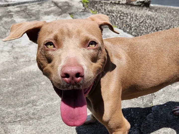 ?????? Nossa filhotona de pit ainda não foi adotada ??????. Ele vive em uma corrente pois lá não tem muros ??????. Ela é extremamente dócil, adoooooora crianças e outros animais … querida linda de olhos verdes ????. Vamos lá ???? Mudar a vida dela ?????? . Já castrada e vacinada 48-999698183 by Joana
