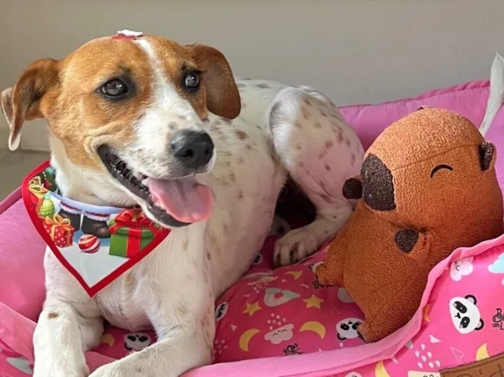 Ela é branca, com a cara caramelo e pintinhas caramelas pelo corpo também. Tem mais ou menos 1 ano e meio, de porte pequeno para médio.