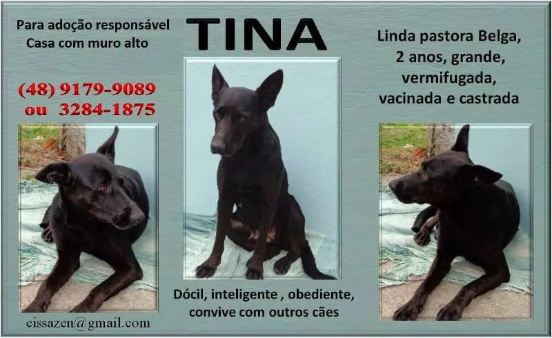Tina, esta linda pastora belga, foi abandonada em Ponta das Canas. Aguarda por uma família responsável e amorosa, retribuirá com muito carinho.