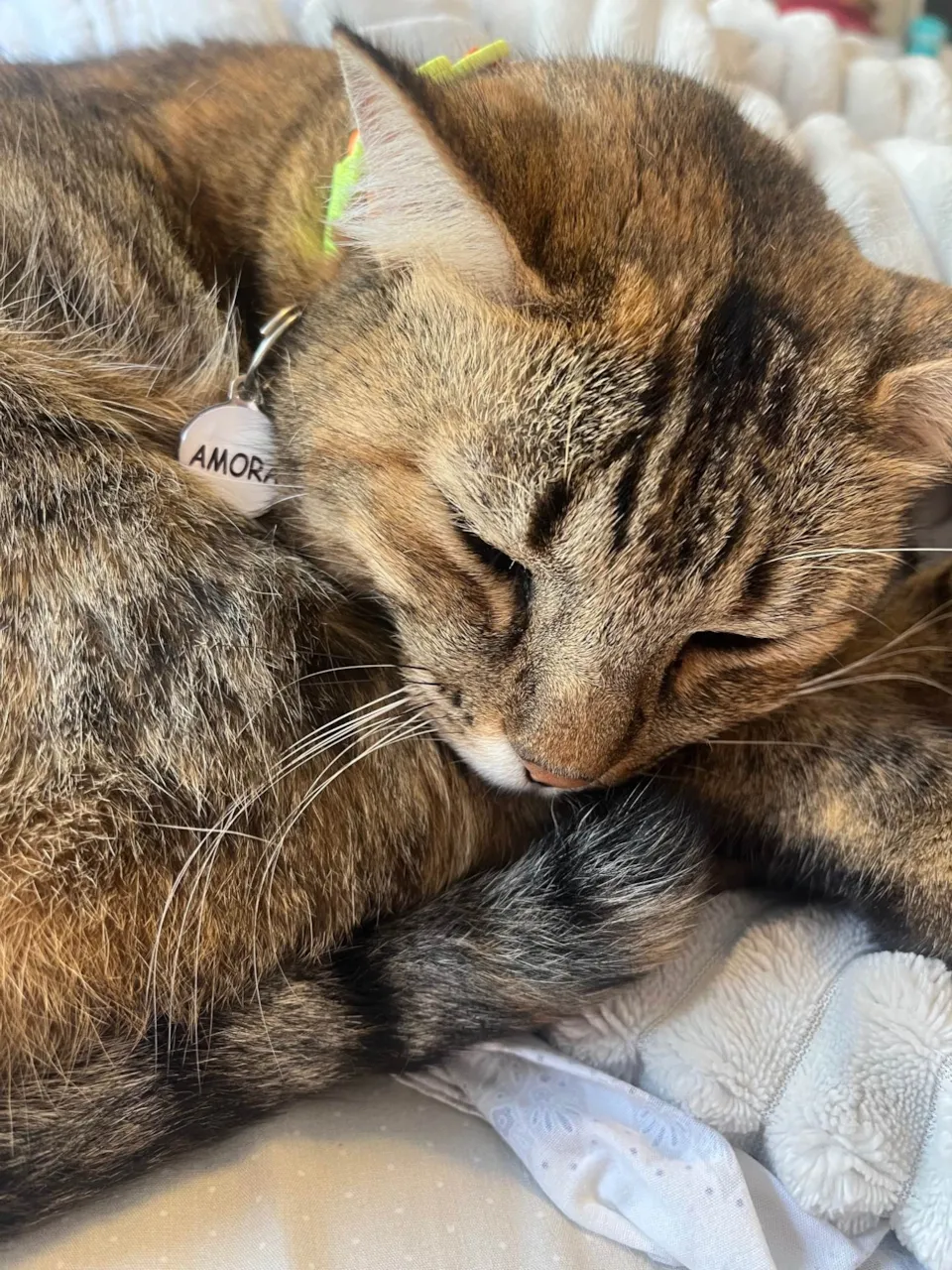 AmoraFêmea com 8 anos, castrada e vacinada, porte médio, cerca de 7kg.Muito dorminhoca, dorme praticamente o dia todo em cima da cama ou dentro do armário. Gosta muito de carinho e de tomar água da torneira. Atende quando chamada, e sabe passear na guia.