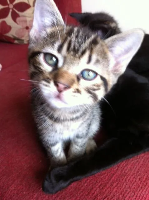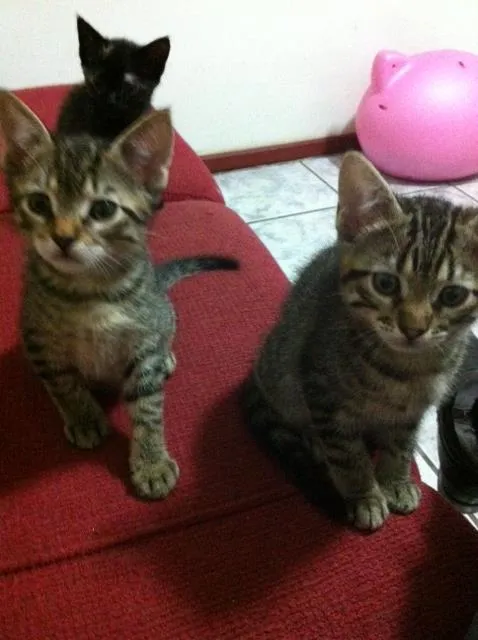 De uma ninhada de 6 filhotes, ainda restam 3 bebês para adoção, sendo dois machos e uma fêmea. Os machos são cinza tigrados e a fêmea é preta com manchas laranja e branca.