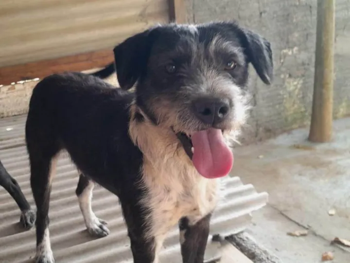 Um cão de aproximadamente 12kg, vira latinha branco e preto com o rosto barbado parecendo um velhinho. Tem dois anos, é energético e mal comportado, mas muito inteligente, e pode ser treinado por alguém que tiver experiência com cachorros. Por enquanto não se dá bem com outros animais, mas tenho certeza que isso pode mudar. Merece amor e um lar que cuide bem dele.