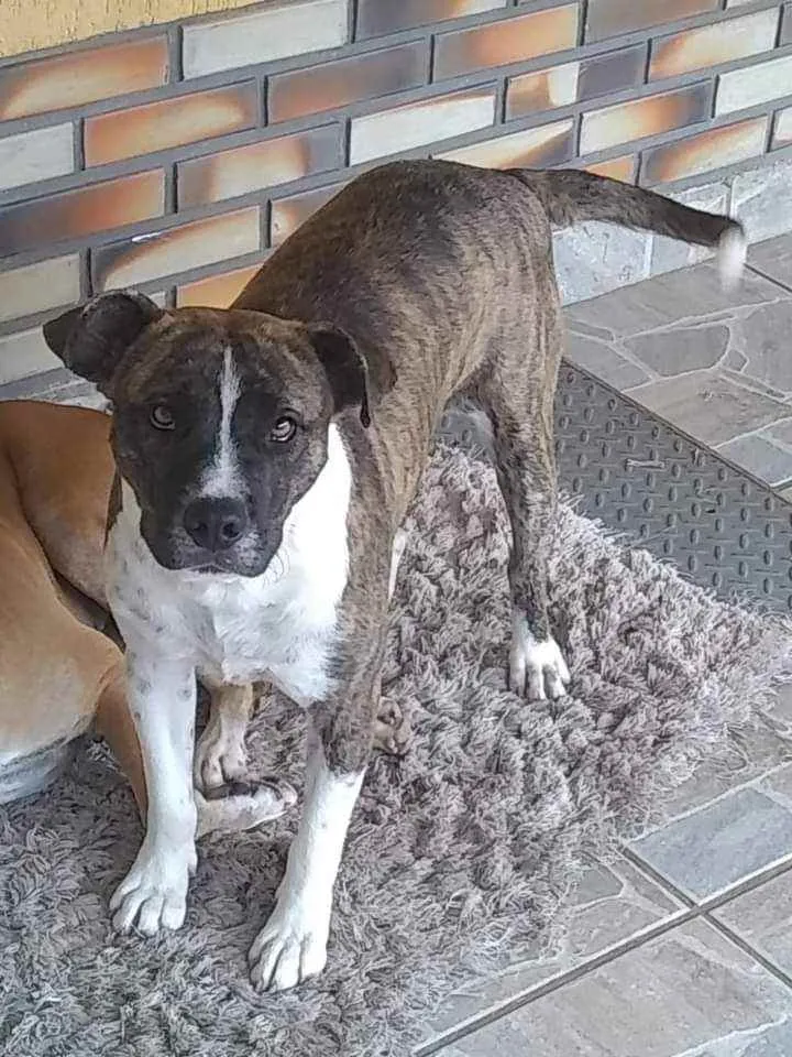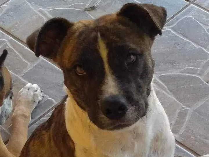 Este cão estava abandonado, estamos cuidando dele mas não temos como ficar, pois temos 3 cães, e um deles é um Boxer já velhinho e com problema no coração. Estamos doando o Tigrão como o chamamos, ele é muito dócil, obediente, adora crianças.