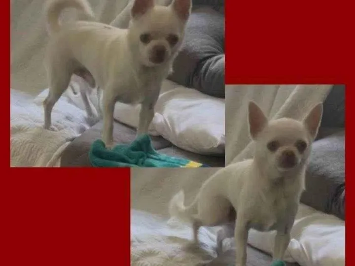 Chihuahua branco, dócil. Atende pelo nome de Billy