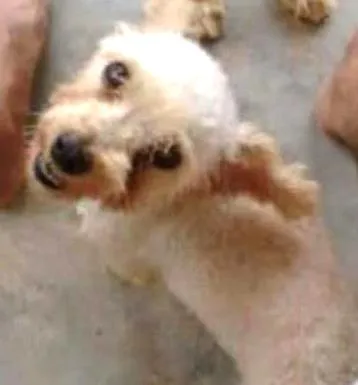 Poodle, macho, pelagem cor champanhe. Pesa em torno de 3,5Kg. Porte pequeno e bem magro. Está com o nariz machucado em tratamento. Manca com a pata traseira, porém sem machucado, como um tic nervoso. Não tem testículos de nascença.