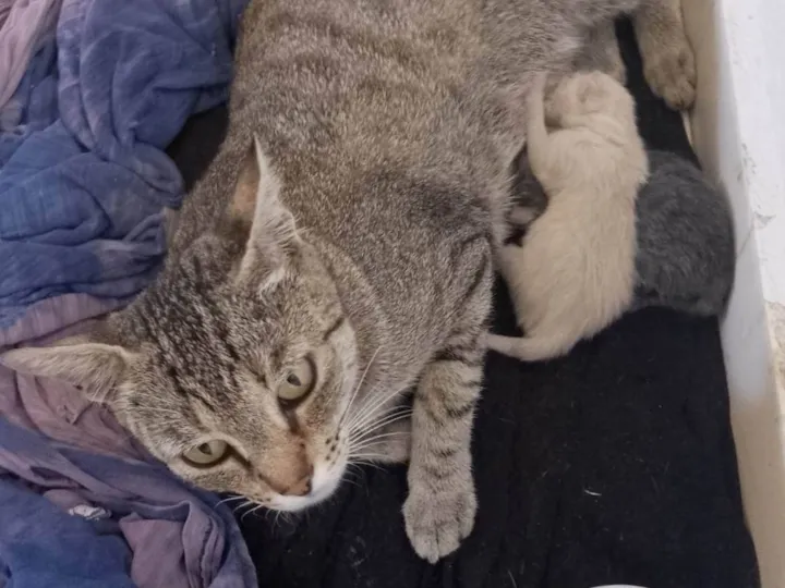 A Gata é extremamente dócil, educada e boazinha, ela é um amorzinho convive super bem com pessoas, é curiosa, experta, ela tem 2 filhotes que nasceram dia 14/02/2025 ambos estão disponíveis pra adoção responsável alguém que cuide e ame os bichinhos. Ambos são a coisa mais linda e fofa, a gata tem uma pelagem cinza com algumas listras pretas, lindos olhos verdes, os filhotes um é beginho com marrom, e o outro cinza com branco