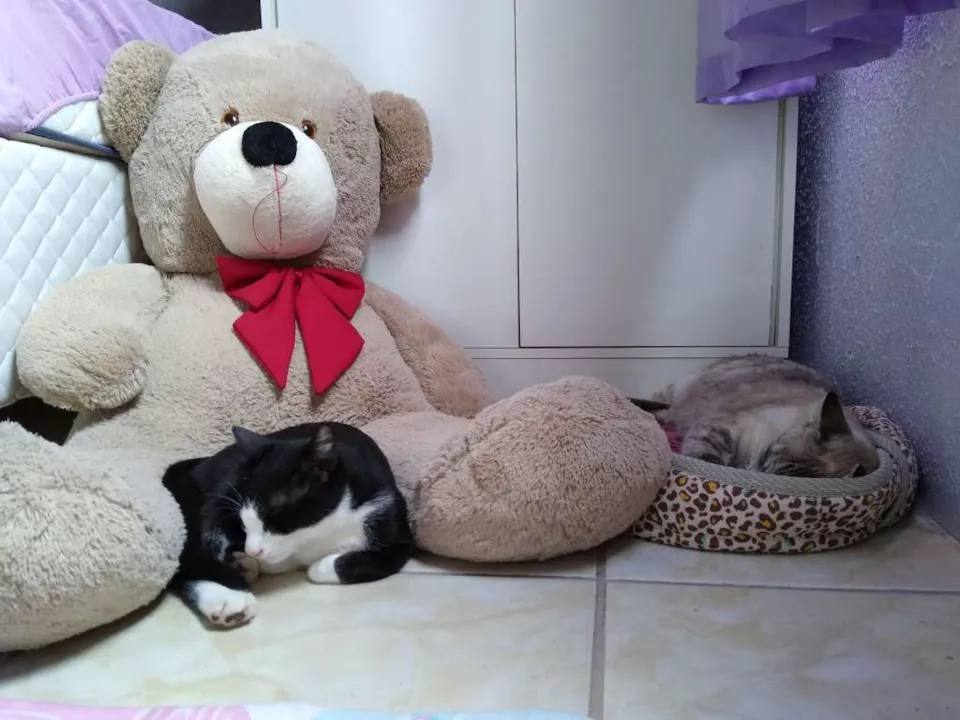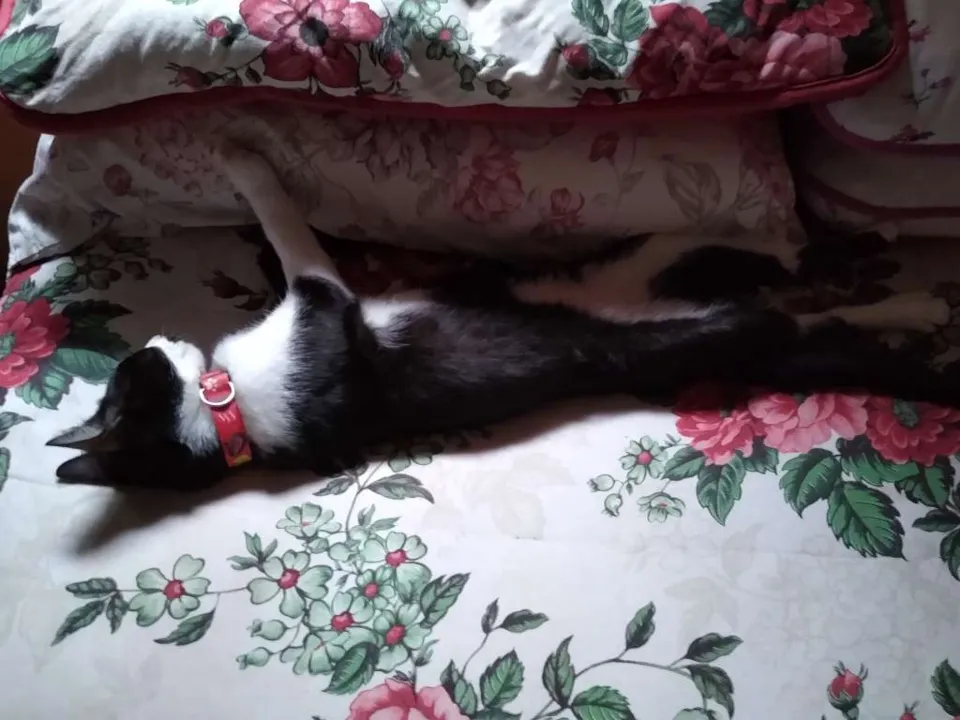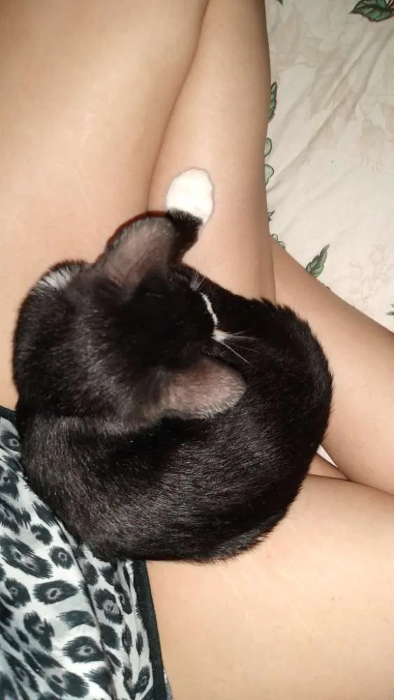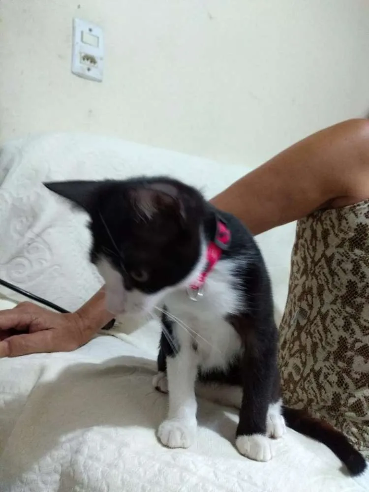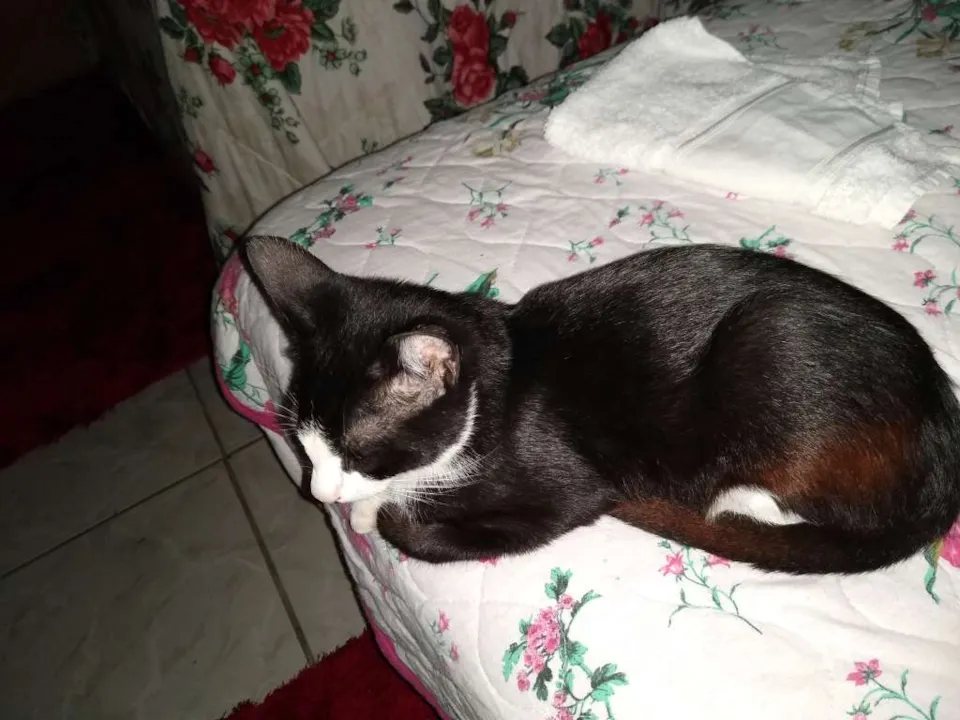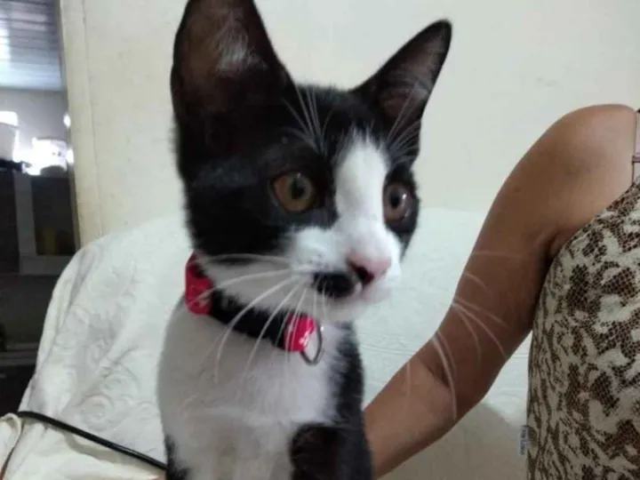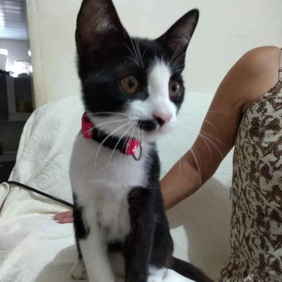 Muito dócil, olhos quase castanhos, tem mancha marrom clara na coxa, uma patinha traseira parece maior do que a outra devido a um acidente que sofreu, tem uma manchinha preta no nariz e bigode