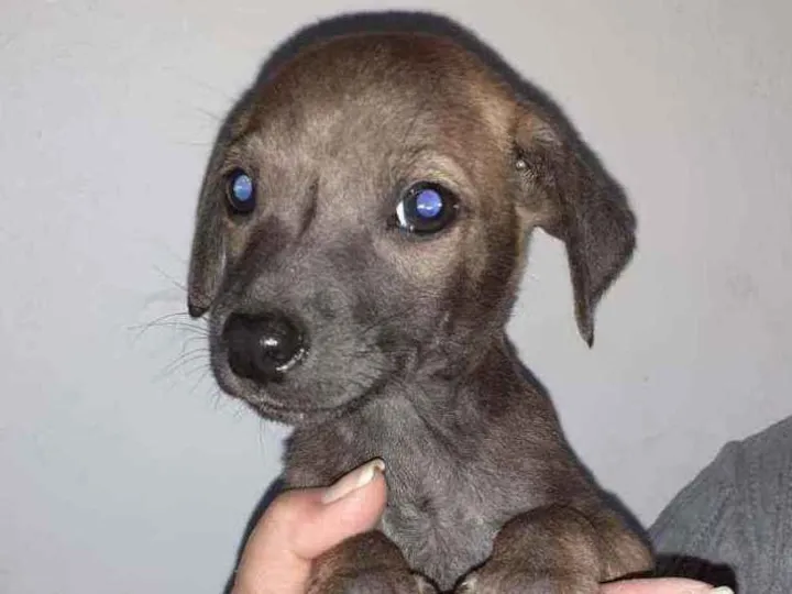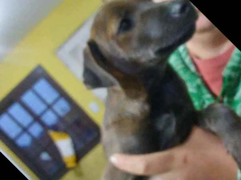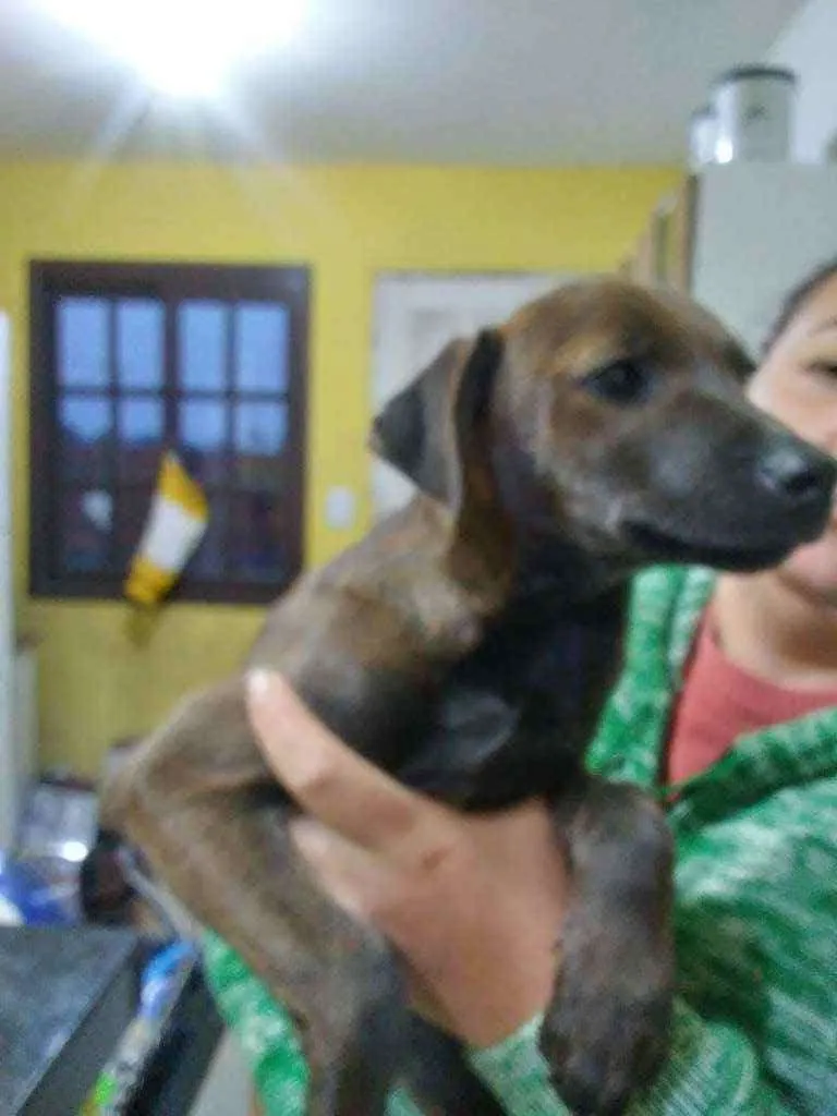 Cão com raça SRD de porte pequeno pelagem curta 2 meses de idade comendo ração.