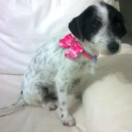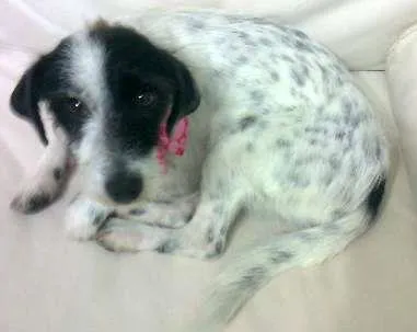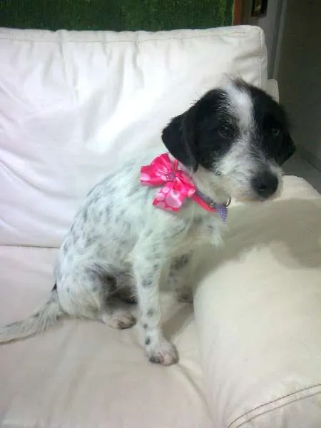 Ela tem pelos curtos e é branca com pintas pretas por baixo do pelo branco, por isso botei o nome de Poá. Ela é carinhosa, obediente e quase não late. É ótima para dormir, não me incomodou a noite toda. Já está castrada e com remédio para pulgas. Adora passear e acompanha bem e não late para os outros cachorros, é forte e bem saudável. Ela precisa urgentemente de lar.