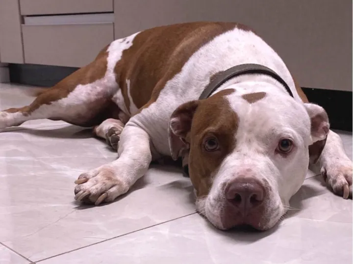 Toby, um lindo Pitbull de pelagem branca e marrom, macho de 5 anos de idade à procura de um lar amoroso. Toby é um cão de porte grande, mas com um temperamento extremamente dócil, calmo e brincalhão. É sociável, independente e adora receber carinho, tornando-o um excelente companheiro para qualquer família.