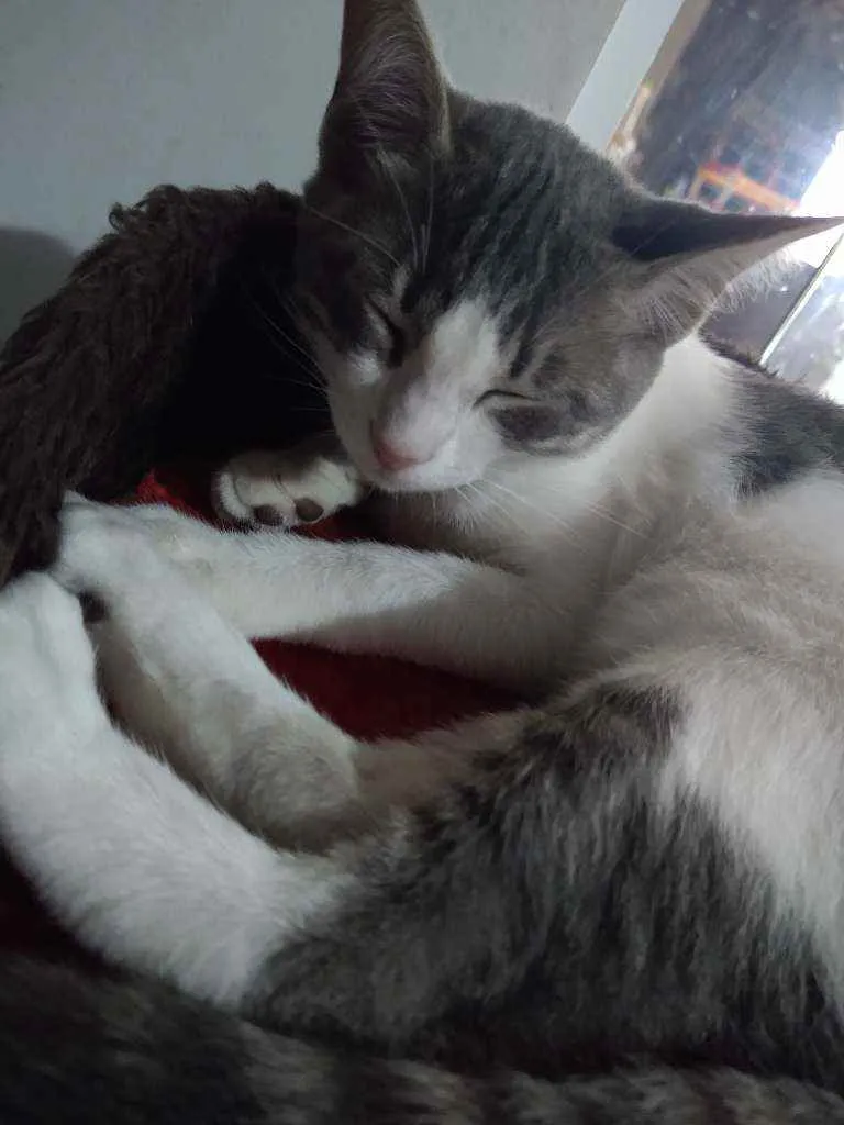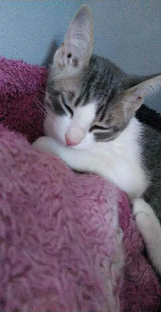 Filhote de 04 meses, usava uma coleira rosa de joaninha com pingente boleado com sino.