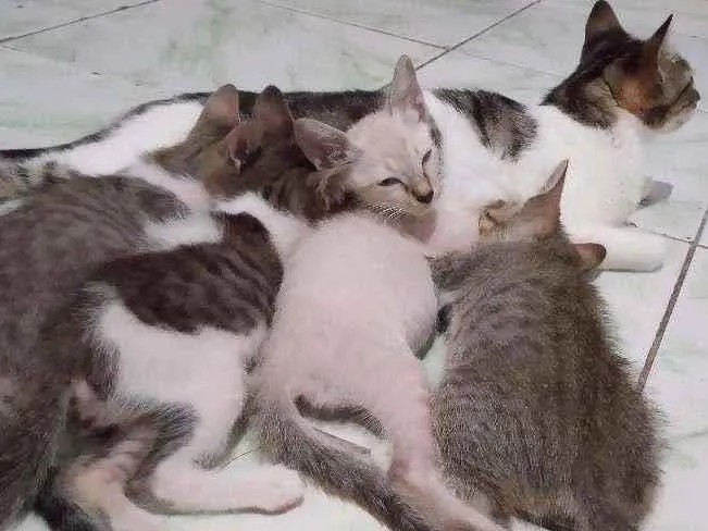 Não sei a idade da gata mãe pois eu encontrei na rua, mas ela é grande, os gatinhos tem 3 meses, gostaria que todos fossem adotados juntos, eu dou o saco de ração e as caixas de areia.