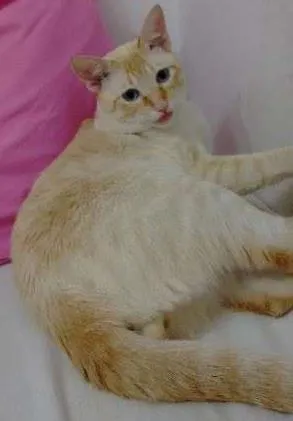 Gato branco com algumas manchas laranjas; patas, focinho e orelhas cor-de-rosa. Um pouco arisco devido à convivência de cinco meses com a mãe [uma gata de rua].