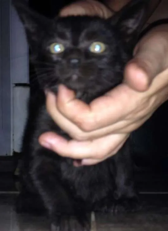 Abandonada no capo de um carro velho gatinha cor preta , dócil, come ração, olhinhos verdes.Contato 994324937 ou 997214098