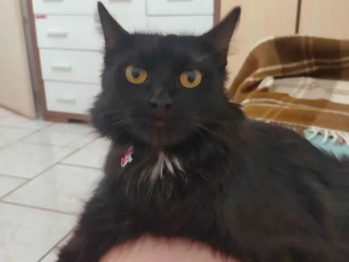 Descrição: Estamos à procura do Flamel, o qual desapareceu no dia 10/março 2025. Ele é um macho castrado de porte médio, pelagem longa e preta, com uma manchinha branca no pescoço. Tem uma marca azul na orelha esquerda. Seu temperamento é dócil e sociável.
