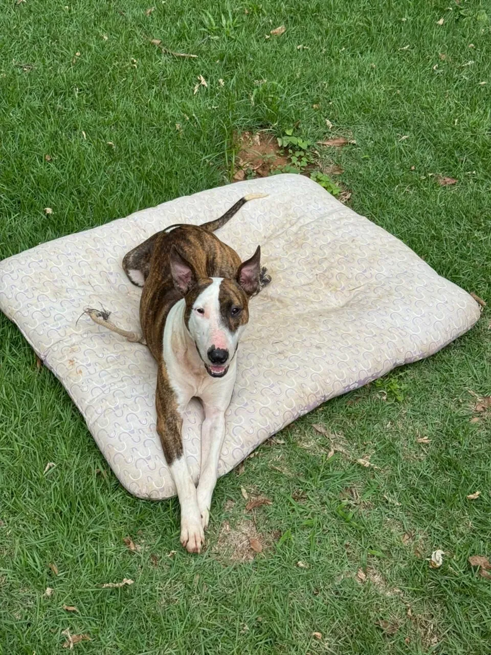 (aparentemente um Bull Terrier) na rua, embaixo de uma árvore, tentando se