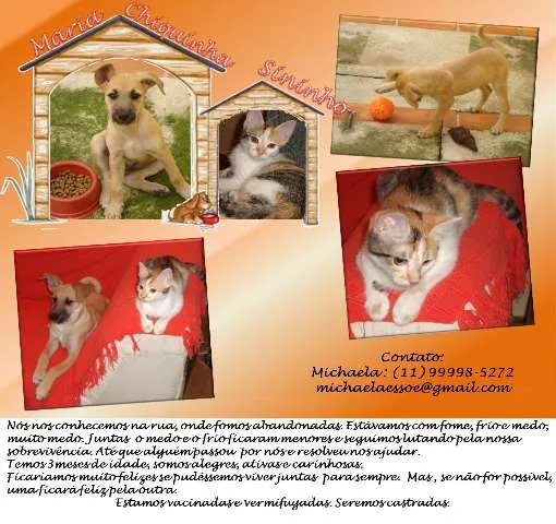 Gatinha resgatada de motor de carro, está em lar temporário. É alegre, carinhosa e se dá muito bem com outros gatos e também cachorros. Está crescendo com a cachorrinha Maria Chiquinha e o sonho de...