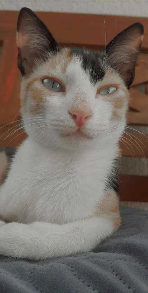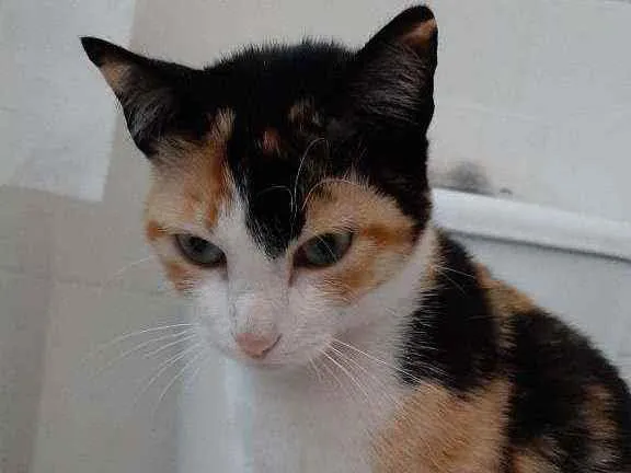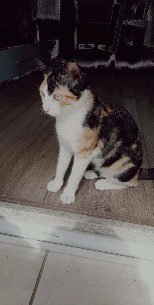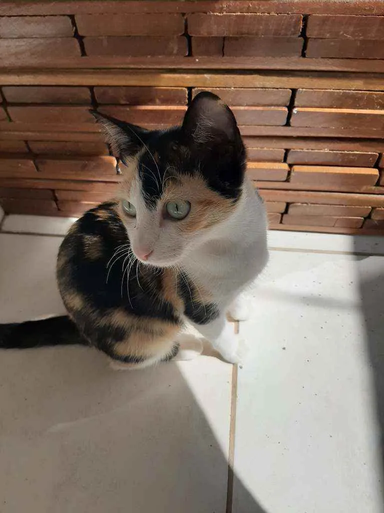 Gatinha pequena parece um filhote, fugiu pelo portão com grade durante a noite. É medrosa e um pouco brava, magrinha e com olhos verdes. Foi a primeira noite na casa nova, EM SÃO CAETANO DO SUL, bairro Santa Maria em frente ao ateliê dos orixas.