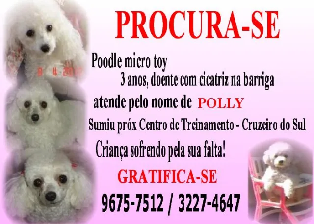Polly, poodle micro toy,tem 3 anos e está doentinha, tem uma cicatriz na barriguinha.Sumiu na madrugada do dia 23/08 nas imediações do bairro JD CRUZEIRO DO SUL próximo ao Centro de Treinamento de Motoristas.