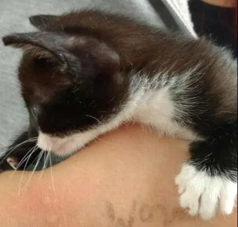 Essa Gatinho macho,preto e branco, dos olhinhos azuis, esta para adoção responsável tem 2 meses,já come ração,é muito esperto e brincalhão e precisa de um lar urgente,pois onde esta corre riscos!!