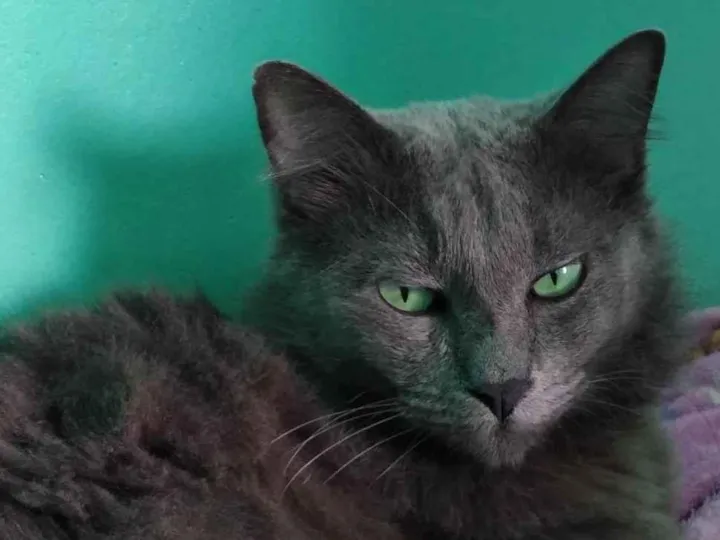Gato cinza peludo, olho esquerdo maior que o direito. Tem um pique na ponta da orelha. Gato idoso com aproximadamente 10 anos. Não conhece a região, pois vive em local fechado.
