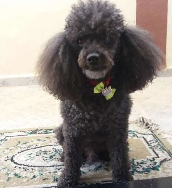 Um poodle preto atende pelo nome de Rusty [Rãsti] tem 13 ano. Ja perdeu alguns dentes,tem problemas cardíaco e um inchaço na pata dianteira. Estava de gravata borboleta verde limão. Ele e minha mãe são muito apegados e ela não passa bem desde o dia da perda.