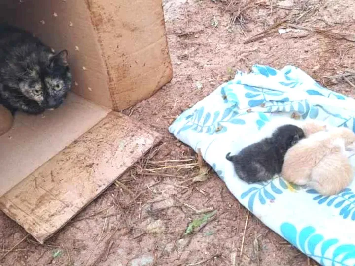 🌟 Conheça essa linda mamãe gata e seus cinco adoráveis filhotes! Eles foram encontrados em uma caixa de papelão e estão em busca de um lar amoroso. 🏠💕
