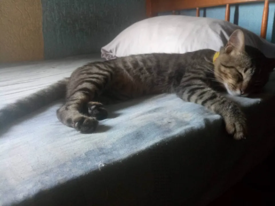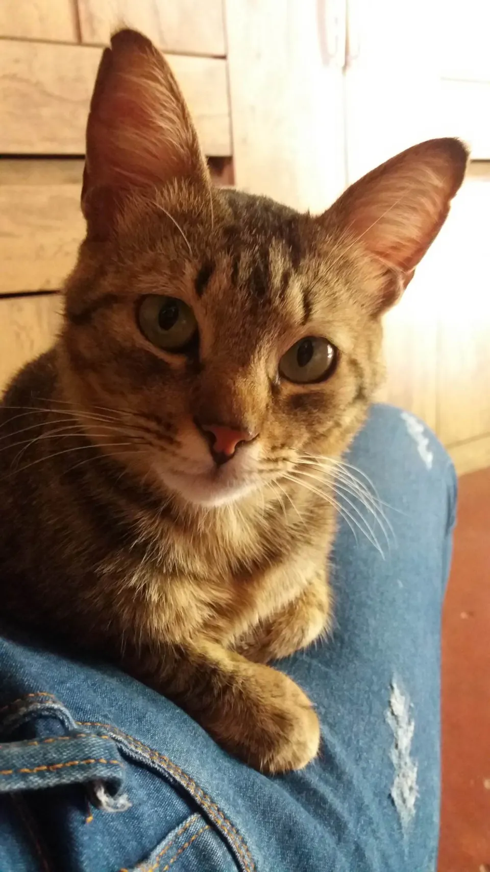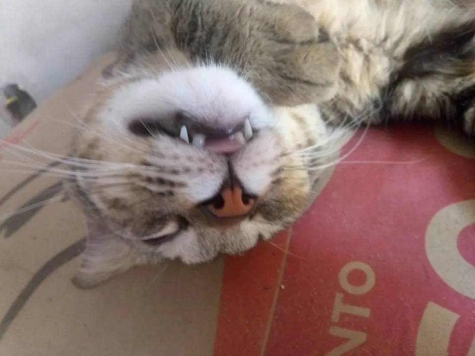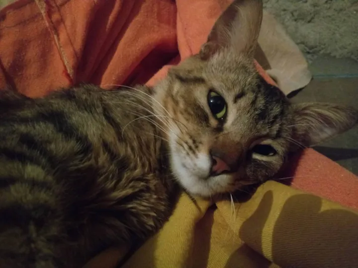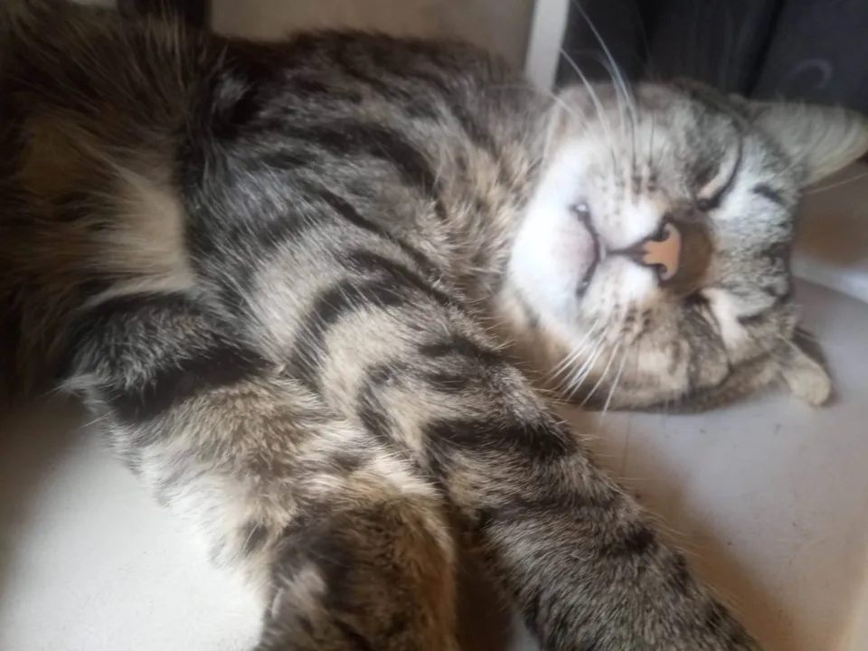 Rajado cinza, orelhas pontudas, queixo branco, barriga amarelada, focinho rosa, olhos verdes, delineado marcado.