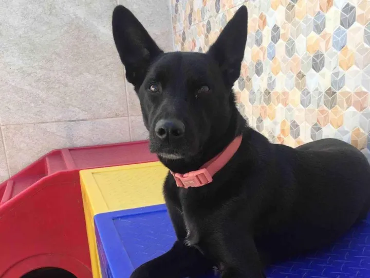 Apollo, 3 anos, macho castrado, vermífugado e vacinado. SRD, pelo preto, porte médio, de 17kg a 20kg. Muito dócil e brincalhão. Gosta de estar junto e se da bem com outros animais, inclusive gatos. Já sabe alguns comandos como Senta, Deita, Da a pata. Sabe usar tapete higiênico.