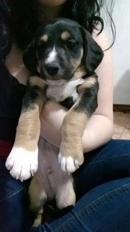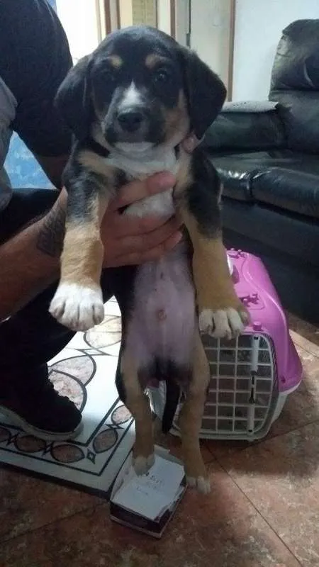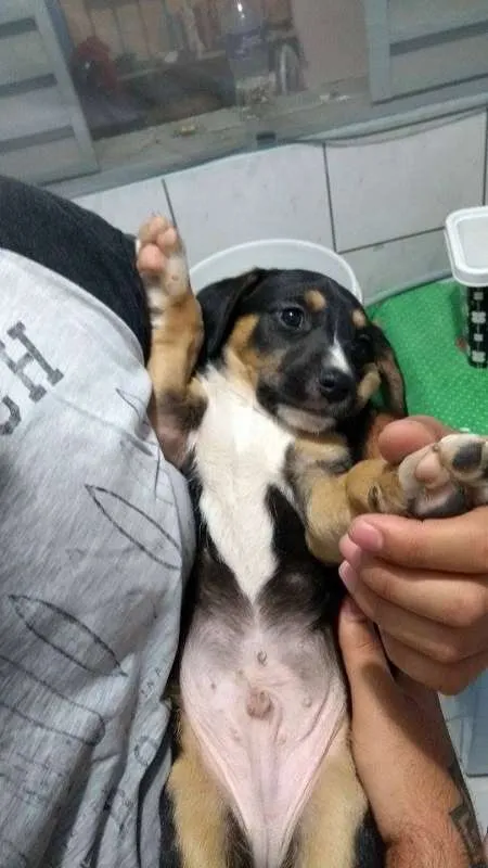 Aparenta ter menos de 2 meses, mas tem o porte indefinido. É brincalhão e bem ativo, aceita bem pessoas e animais desconhecidos e já come ração.