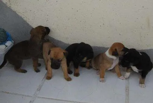Doação de 5 Filhotes de Cachorros, com 24 dias de vida, sem raça definida, não são vacinados/vermifugados e nem castrados, sendo eles: caramelo com faixa branca no pescoço e barriga (fêmea), todo caramelo (fêmea), preto e caramelo (macho), caramelo com capa preta (macho), preto com faixas brancas e caramelo (macho).