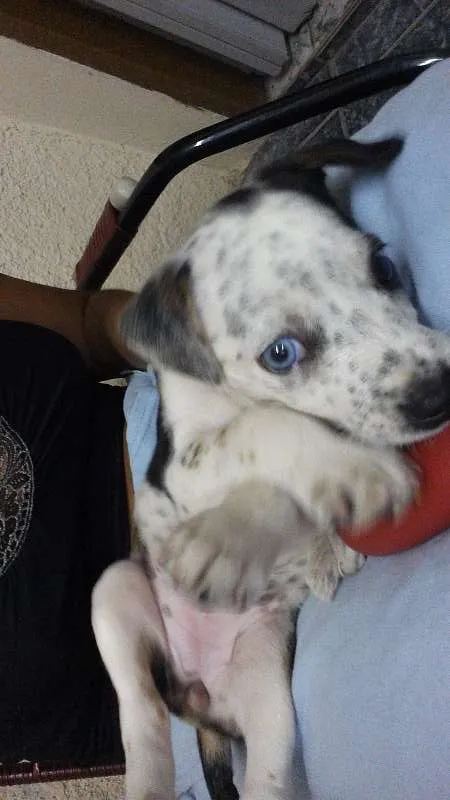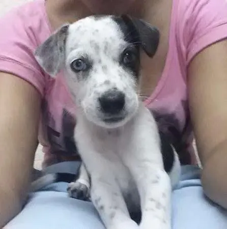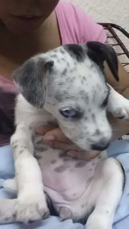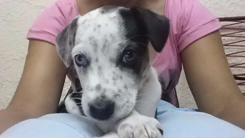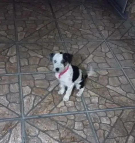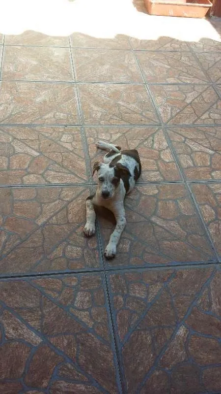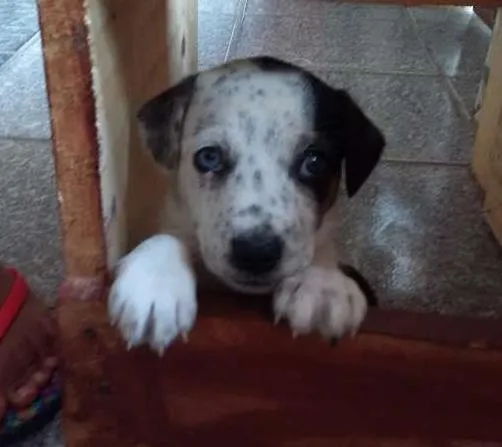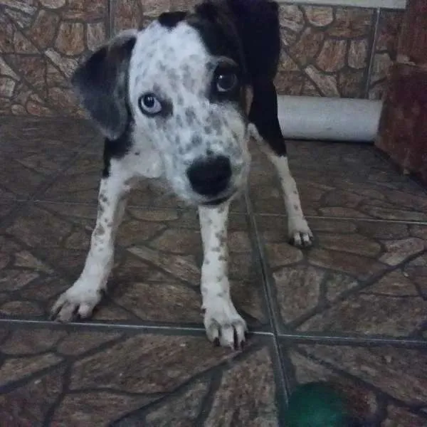Cachorrinha resgatada da rua com semanas de vida, ja esta com 4 meses, é super alegre brincalhona e animada. Ja foi vermifugada, vacinada e em breve será castrada. Pêlo curto preto branco e mancha marrom perto dos olhos. Ela é linda. Olhos um castanho outro azul. Barriguinha gorda rosada com pintinhas pretas que lembra dálmatas. Hiper ativa, gosta mesmo de correr e brincar com bolinhas. Ideal para crianças e quem ja tem outros cachorros. Nao tem raça definida, porte médio, magra musculosa rs. Levo até a pessoa que for adotar essa belezinha :)