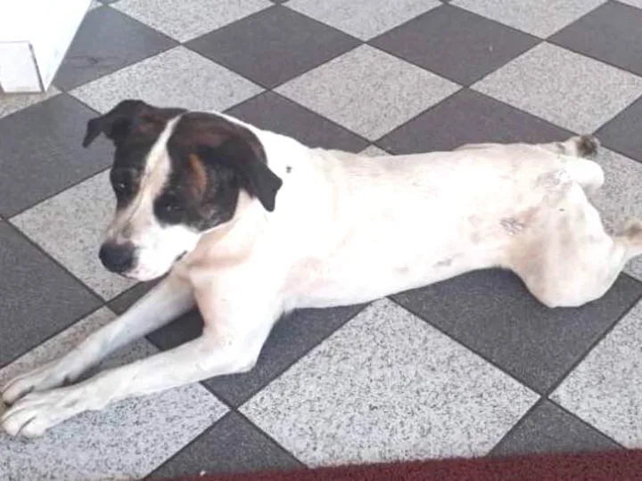 cachorro branco com rosto tipo mascara preta com caramelo no olho, rabo cortado parece ser mistura de raças de pitbull com fila, resgatado na rodovia santos dumont proximo ao bairro jd. itatinga