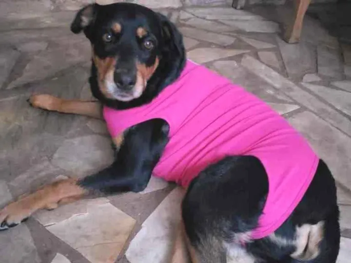 cachorra de 6 anos, 30kg, preta com extremidades marrons (característica de rottweiler, apesar de ser vira lata), tem uma cicatriz bem grande no abdômen (mastectomia) e displasia coxofemoral, dócil mas se assusta com barulhos altos e crianças.