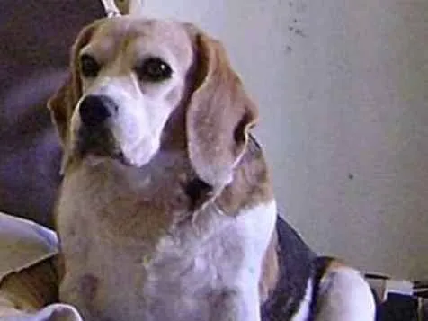 Tampa é uma fêmea da raça beagle. Aproximadamente 8 a 9 anos, castrada.