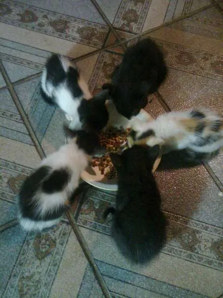 A mãe dos gatinhos é muito arisca e vive na rua, só come quando eu estou longe, mas deu cria e com uma semana trouxe os gatinhos um a um pela boca. Estou cuidando mas não posso ficar com todos.