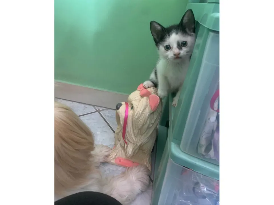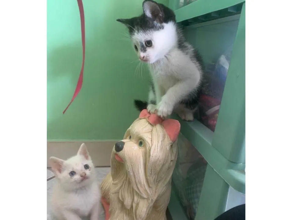 Gatinhos com 45 dias. Já comem ração . Faz coco e xixi na areia. Ambos tem olhos azuis. Doação somente pra casa ou apartamento telado.