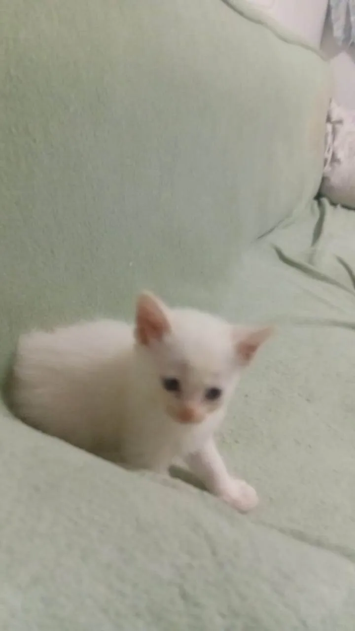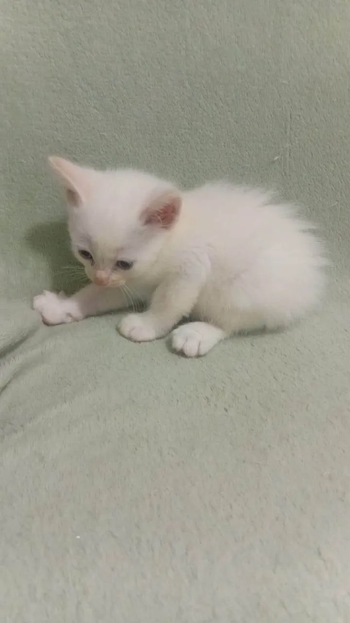 Conheça o Nino, um encantador gato macho da raça SRD (sem raça definida) com pelagem branca e cheio de energia! Com menos de 2 meses, este pequeno está à procura de um lar amoroso e acolhedor.