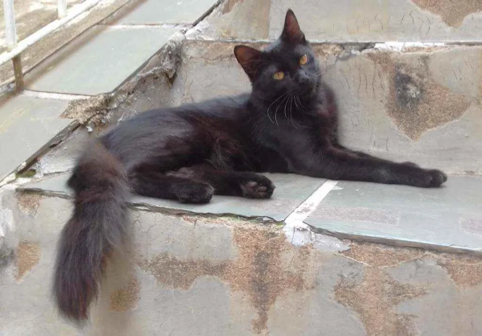 Tem olhos amarelos. Pelagem negra brilhante. É bem peludinho ^_^