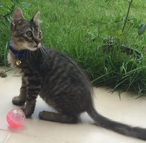 Ele é cinza tigrado, cheio de listras, beeem peludinho e mto bonzinho.