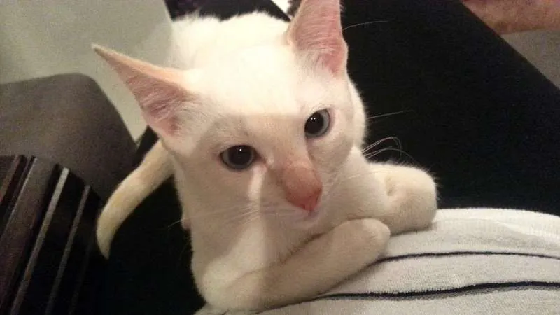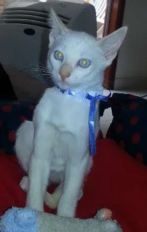 Veiga é um gatinho mestiço branco com as orelhas e rabinhos amarelos, possui olhos azuis. É um doce com pessoas, super carinhoso, curioso, calmo e gosta de crianças.