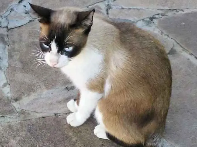 Gatinha(o), muito docil, olhos azuis, pelagem mesclada branca, preta, cinza
