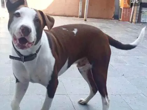 Ele é super docil, é vira lata, misturado com pitbull. Tem casinha e as vacinas estão em dia. Não posso mais cuidar dele infelizmente, amo muito ele, peguei quando ganhei meu filho mais novo. Eles cresceram juntos mais vou ter que me mudar e lá não pode ter cachorro.