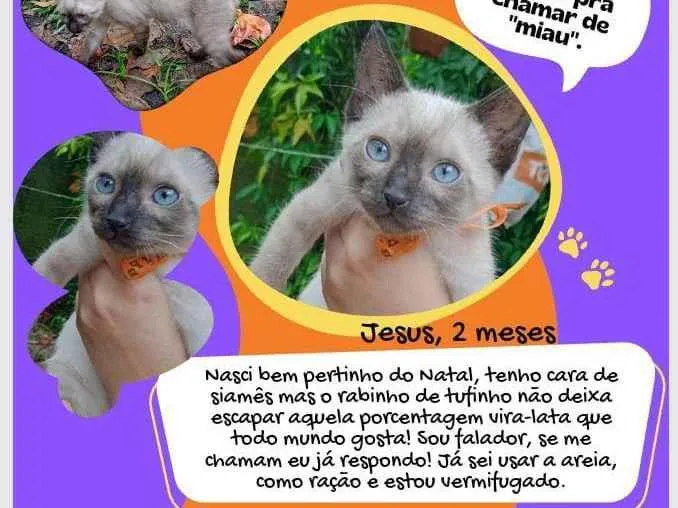 Olá, pessoal! Meu nome é Jesus, apareci bem na época do Natal e tenho apenas 1 mês de vida! Tenho cara de siamês, mas o rabinho cotoco não deixa escapar aquela porcentagem vira-lata que todo mundo gosta! Sou falador, se me chamam eu já respondo. Já sei usar areia e tô começando a comer ração, mas adoro um tetê! Já estou vermifugado e a procura de um lar pra chamar de "miau".