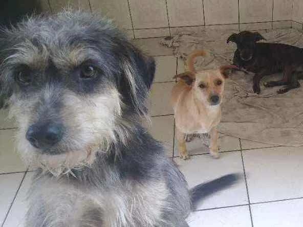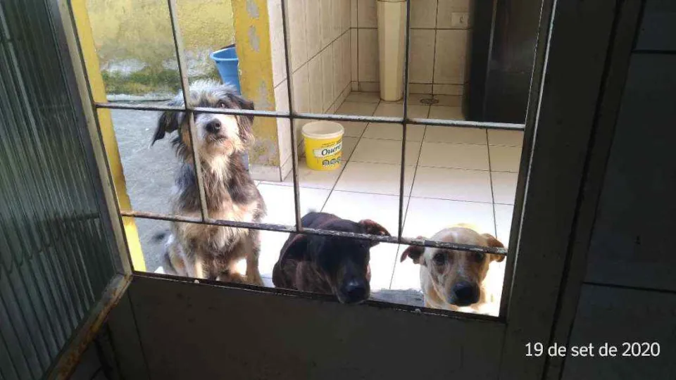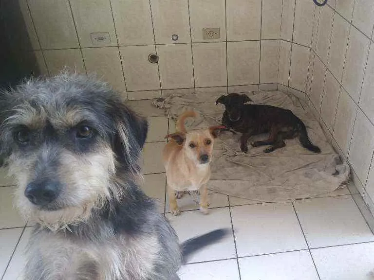 3 cachorros,são irmãos,um com pelagem caramelo/amarelo,outro marrom mesclado e outro branco com preto e um pouco mais peludinho.