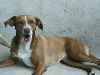 Cachorra médio porte, marrom e branca, castrada e vacinada contra raiva, com 8 anos e dócil.