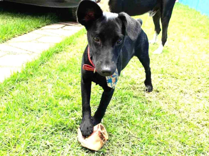 cachorro todo preto, encontrado em Taboão da Serra com o rabinho cortado, trouxe pra casa mas procuro o dono pois tenho um cachorro grande, entrar em contato se for o dono.