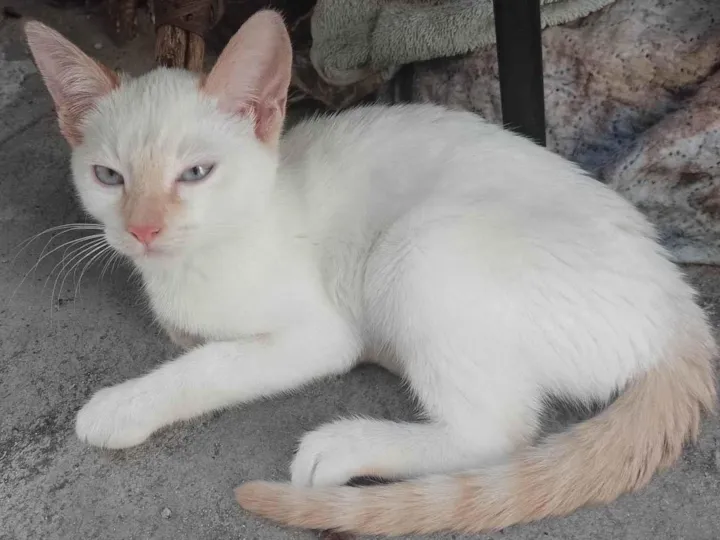 Uma gata branca com rabo e orelhas laranja encontrada na rua, estou como lar temporário dela. Sabe usar caixa de areia