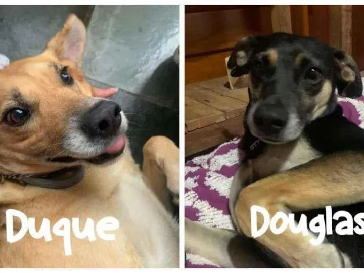 Duque e Douglas podem parecer muito diferentes. Mas eles se complementam de forma muito especial. Ambos são porte médio. O Duque é um cãozinho extremamente calmo e sociável. Ele facilmente vira o centro das atenções, pedindo carinho para todos ao redor. Se dá bem com crianças e outros animais. É paciente e já é idoso, tem cerca de 10 anos. Mas tem ainda muito amor para dar e muita disposição.