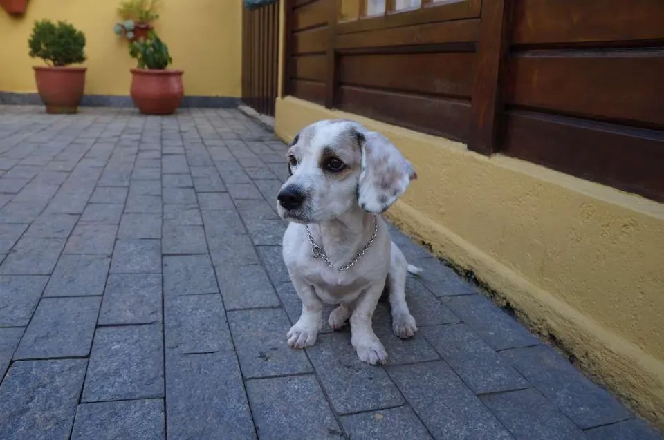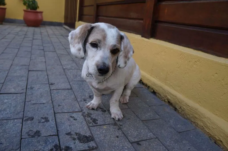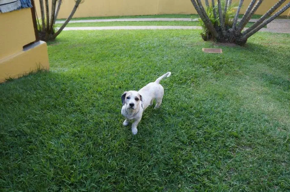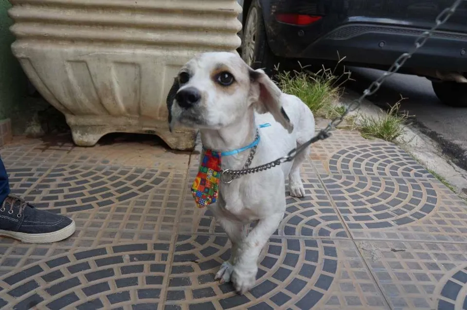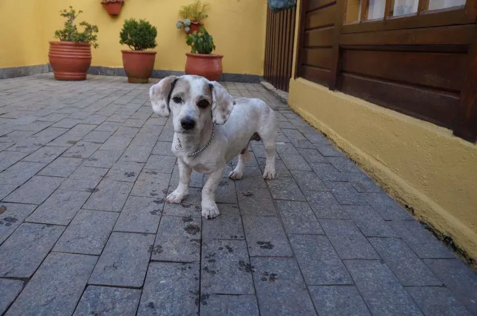 Eu sou o Pudim. Sou porte pequeno meio pesadinho (peso 10,9kg, sou compridinho, mas bem baixinho) e tenho cerca de dois anos de idade. Eu estava perdido na rua, com muito medo. Mas fui resgatado. Meu pelo era enorme e cheio de nós. As tias acham que sou um mix com llasa apso e basset, devido à minha pelagem e às patas bem curtinhas. Atualmente estou com o pelo todo tosadinho.